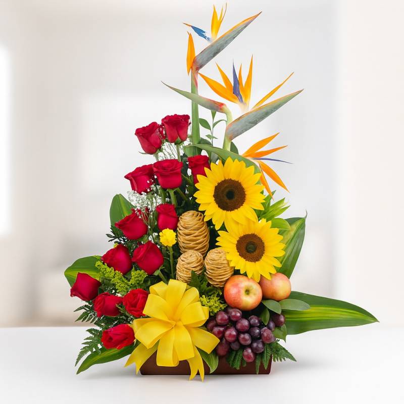 Envíale un detalle muy especial a tu ser querido, este lindo diseño floral elaborado sobre una base de madera contiene 20 rosas rojas, girasoles, aves del paraíso, follajes verdes y variedad de frutas frescas. Sugerimos que acompañes este diseño con chocolates, peluches, globos o vinos para hacer aún más especial tu detalle, en el siguiente paso de la compra puedes agregar a tu orden estos productos si lo deseas.