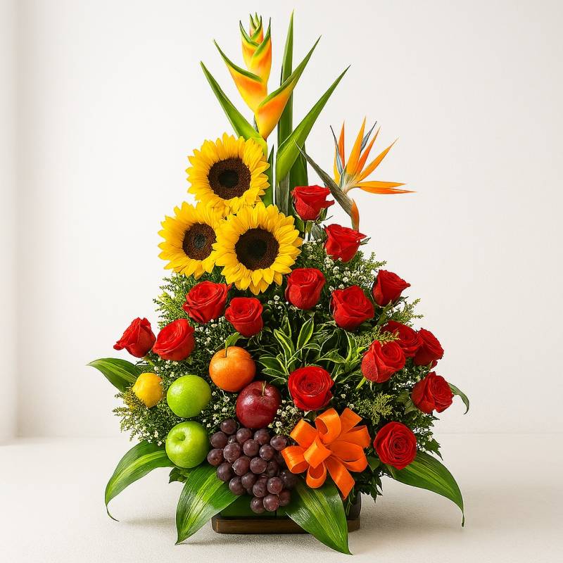 Las flores y las frutas son una de las combinaciones mas perfectas para regalar, envía este lindo diseño floral elaborado sobre una base de madera, contiene 18 rosas rojas, girasoles, heliconia, ave del paraíso, follajes verdes y frutas frescas. Sugerimos que acompañes este diseño con chocolates, peluches, globos o vinos para hacer aún más especial tu detalle, en el siguiente paso de la compra puedes agregar a tu orden estos productos si lo deseas.
