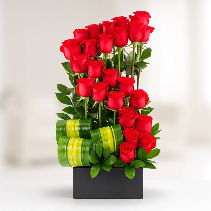 Por medio de este delicado diseño podrás expresar todo tu amor y afecto a tu ser querido, regala esta linda caja con 25 rosas y follajes verdes y demuéstrale lo importante que es para ti. La base es una caja en material de cartón. Sugerimos que acompañes este diseño con chocolates, peluches o vinos para hacer aún más especial tu detalle, en el siguiente paso de la compra puedes agregar a tu orden estos productos si lo deseas.