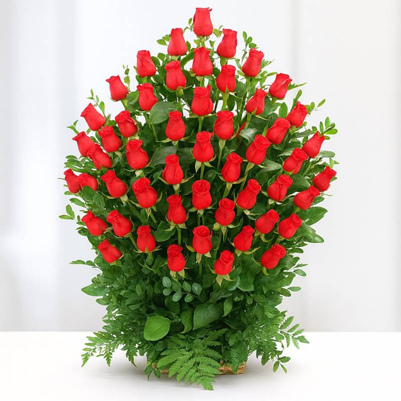 Las rosas significan amor y romance, pues bien, este diseño solo te permite expresar ese hermoso sentimiento, envía este lindo arreglo floral elaborado en una base de madera, compuesto de 50 rosas y follajes verdes. Sugerimos que acompañes este diseño con chocolates, peluches, globos o vinos para hacer aún más especial tu detalle, en el siguiente paso de la compra puedes agregar a tu orden estos productos si lo deseas.